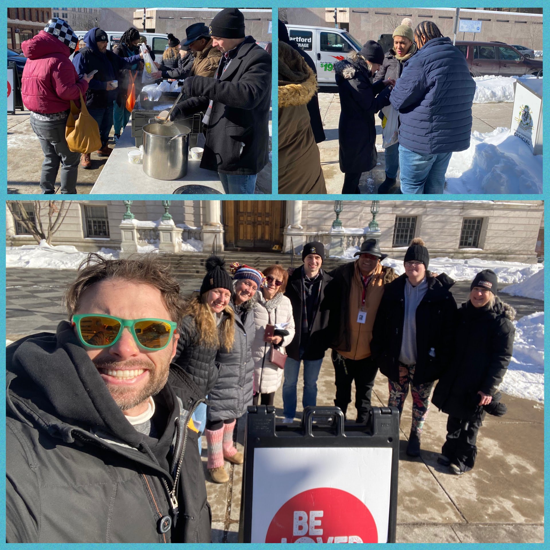 We unloaded the van and awaited our friends. Since we were in cold-weather protocols, we did not have a service, but we served hot chocolate and coffee, lunches and soup, and gave the daily readings to all who came by. We also had blankets for those in warming centers and tents.