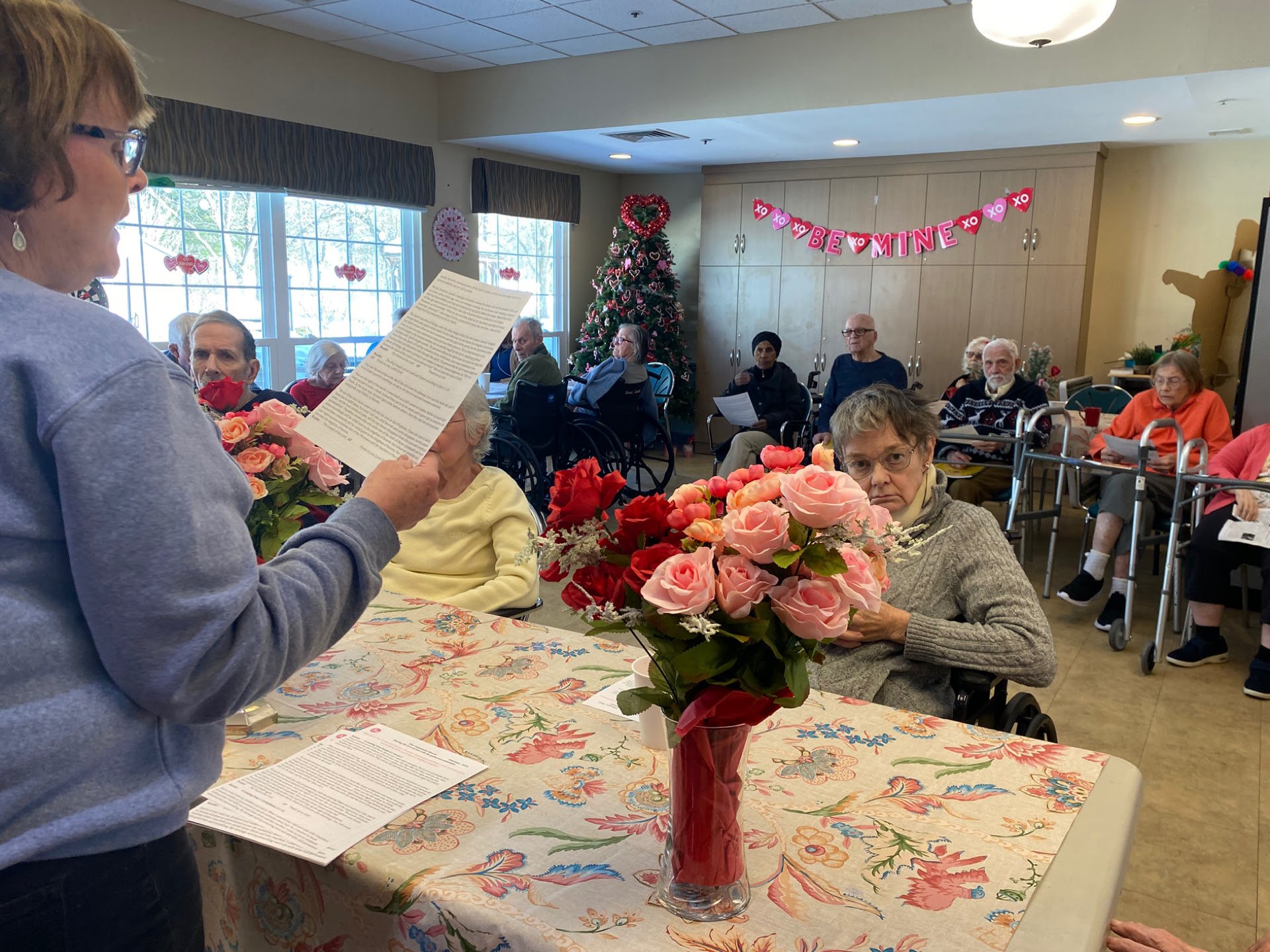 Mary and I met up for the service at Arden Court. She loves to change up the slik flowers we bring with us each week and since this is “Valentine Month” she had pretty red and pink flowers.